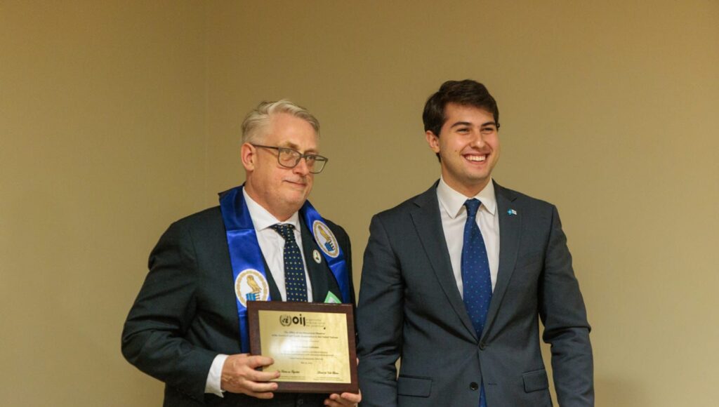The plaque was presented by Ambassador Daniel del Valle Blanco, Permanent Observer OIJ to the United Nations, and Dr. Otto von Feigenblatt, Deputy Permanent Observer to the OIJ to the United Nations.