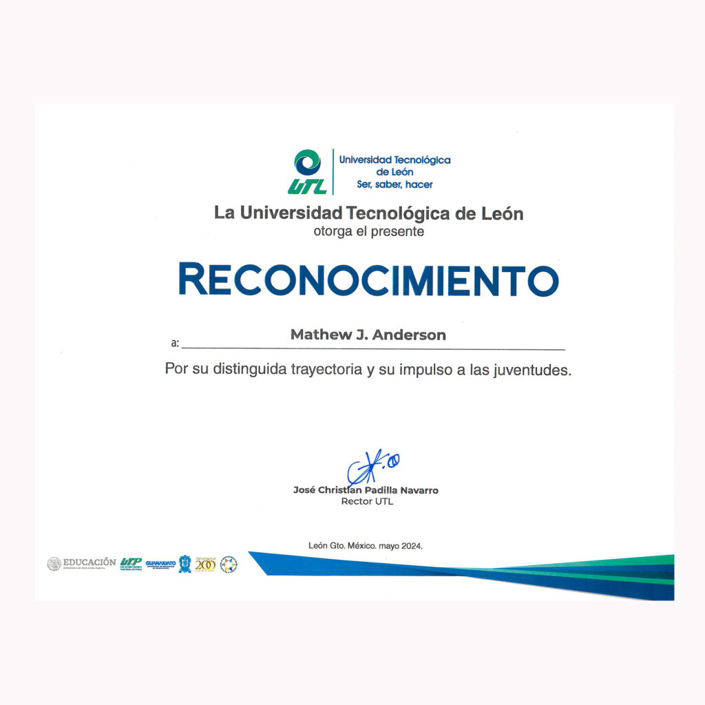 Dr. Mathew Anderson is truly honored to have received recognition from the Technological University of León for his distinguished career and dedicated efforts in empowering youth.