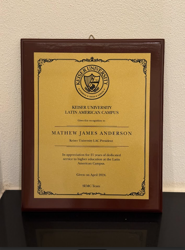 Dr. Mathew Anderson is deeply honored to have received recognition from his management team for his 21 years of dedicated service to higher education at the Latin American campus. They acknowledged his leadership and vision, and he is truly grateful for their thoughtful gesture.